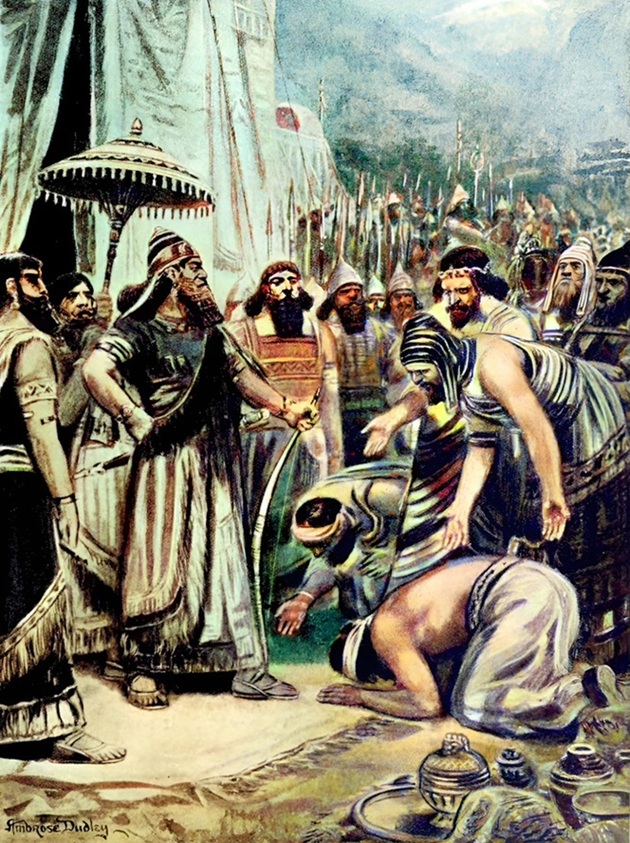 Los filisteos, junto con el reino de Judá, Edom, Moab y Egipto formaron una coalición para enfrentarse a Asiria; pero Sargón II derrotó a la coalición en el año 711 a.C. obligando a estos reinos a pagar tributo y ser sus vasallos. En el 710 a.C. el ejército de Sargón II ataca Babilonia, terminando por conquistarla y coronándose rey de Babilonia habiendo conseguido un gran botín de guerra. En el 707 a. C. Sargón II se dedicó a terminar la ciudad de Dur Sharrukin («Fuerte de Sargón»), ubicada a unos 16 km al noreste de Nínive y destinada a ser la nueva capital de Asiria. Pero falleció en el año 705 a.C. durante una batalla al sofocar una revuelta en el reino de Tabal. Senaquerib, hijo de Sargón II,sucedió a su padre e hizo de la ciudad de Nínive la nueva capital. El reino de Egipto, temeroso del poder de Asiria, intrigó con el reino de Judá para apoyarlo económicamente si enfrentaba a Asiria. Ezequías, rey de Judá, se negó a pagar el tributo a Asiria, por lo que Senaquerib decidió invadir Judá en el 701 a.C. poniendo sitio a la ciudad de Jerusalén. Egipto apoyó a Judá enviando un ejército; Senaquerib guió sus tropas y batalló contra los egipcios derrotándolos por completo en una encarnizada batalla; pero quedando debilitado levantó el sitio de Jerusalén no sin haber devastado toda la región; lo que obligó al rey Ezequías a pagar tributo a Asiria nuevamente.
