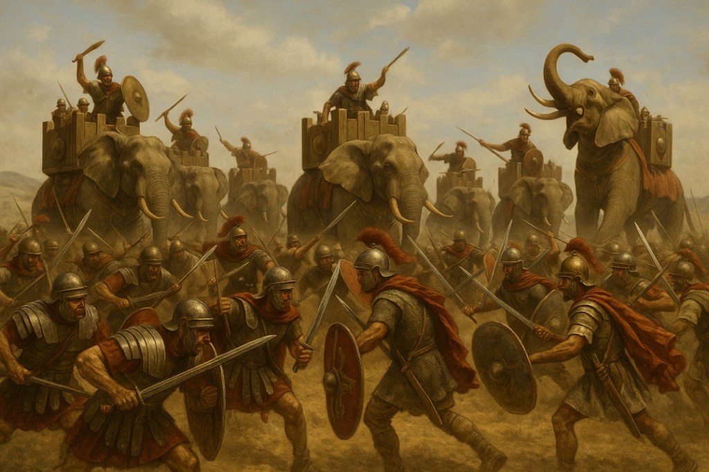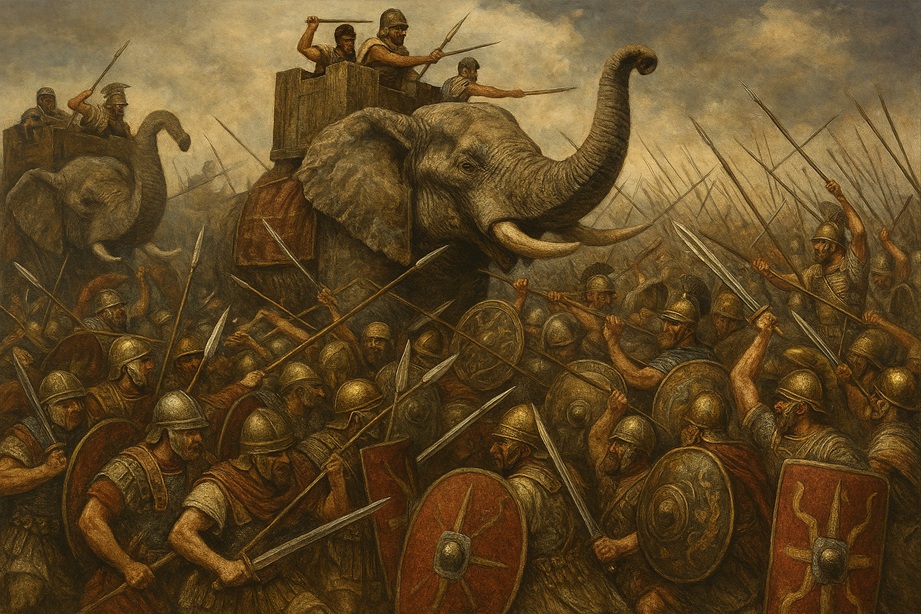 Pirro atacó a los cartagineses en Sicilia sin obtener grandes resultados, por lo que opta por retornar a Italia y enfrentarse a los romanos en la Batalla de Beneventum o Benevento en el año 275 a.C. En esta ocasión las legiones de Roma atacaron a los elefantes con flechas de cera ardiendo en sus puntas, lo que provocaría dolor en los elefantes haciéndoles perder el control. Según las fuentes históricas no hubo claro vencedor; sin embargo, Pirro perdería un gran número de sus tropas lo que le obligó a retornar a Grecia dejando a los romanos conservando su territorio tras una guerra de desgaste.