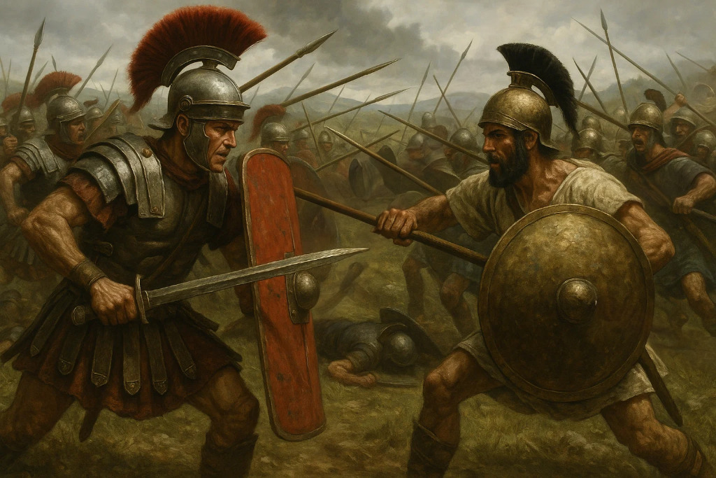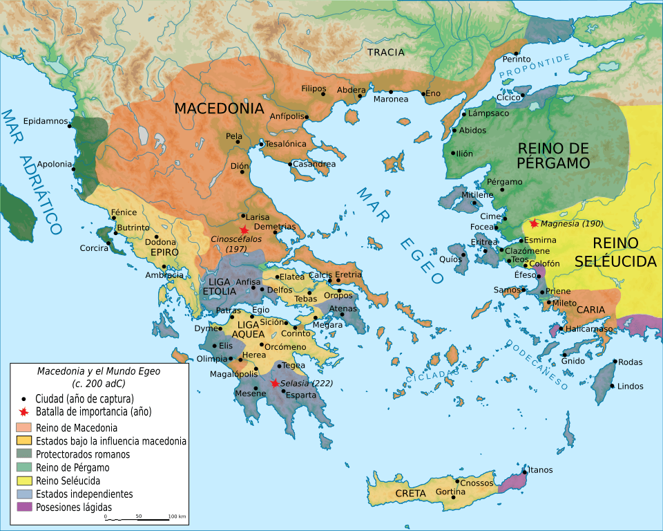 Las legiones romanas avanzan sobre Macedonia, hasta el encuentro entre el ejército de Filipo V y las legiones de Tito Flaminino en el año 197 a.C. en la Batalla de Cinoscéfalos donde las legiones de Roma derrotan a las fuerzas macedonias dirigidas por el mismo Filipo. Este firmaría un tratado de paz con Roma que implicaba abandonar las ciudades griegas y la supresión de toda su flota de guerra. La República dejaba en Grecia varios destacamentos romanos distribuidos en varias ciudades como Corinto y estableciendo el dominio romano sobre las ciudades griegas permitiendo sobre estas cierta autonomía.