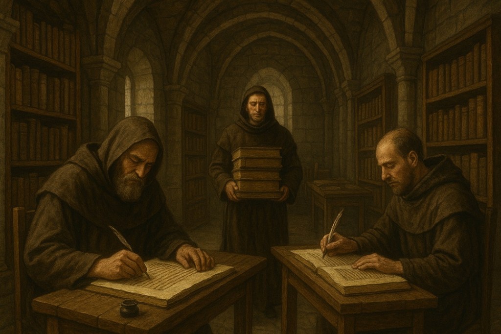 Las primeras bibliotecas dentro de monasterios y los scriptoriums datan del siglo VI. Destacaron en la copia y preservación de libros los monjes benedictinos, los cartujos y los cistirciences. Los principales libros y manuscritos a copiar eran de carácter religioso; no obstante, algunas bibliotecas en los monasterios resguardaban libros y manuscritos antiguos relacionados con ciencias y religiones del pasado consideradas paganas o heréticas para su época.