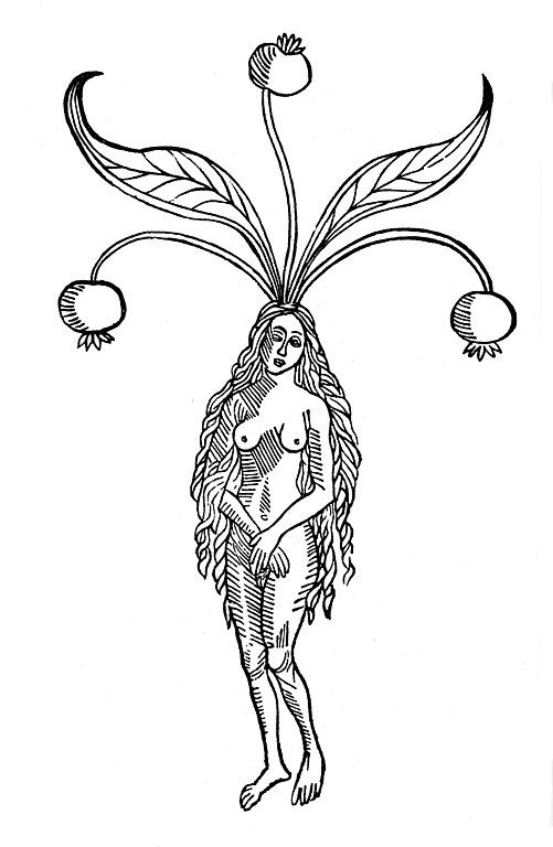 Según la creencia popular medieval alquímica, la Mandrágora debía ser extraída y si sus raíces tenían una exacta forma humanoide debía ser almacenada. En su confinamiento la raíz debía ser embadurnada en sangre o esperma humano de forma continua como fuente de “alimento”, proceso que con el paso del tiempo transformaría la raíz en un Homúnculo (ser con vida).