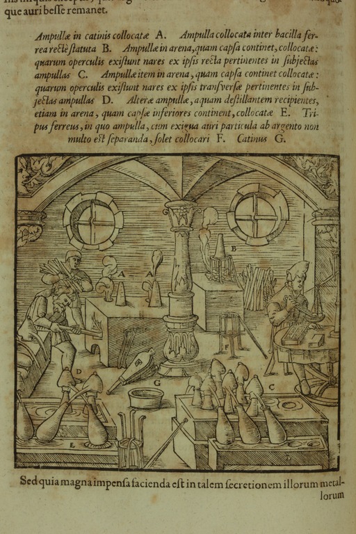 En la práctica, los alquimistas antiguos eran hombres que trabajaban en talleres con aspecto muy parecido al de herrerías y a su vez vestidos como herreros, si bien leyendo pergaminos con anotaciones personales, realizando al mismo tiempo experimentos con implementos diversos y manipulando herramientas de fundición de toda clase, moldeando metales, así como laborar en recámaras con aspecto de establo bordeados de anaqueles atestados de frascos con hierbas, ungüentos, minerales y bebidas utilizados como farmacopea para aliviar síntomas de enfermedades, rodeados de mesas con morteros, fuelles, cubetas, matraces, retortas, toneles y alambiques para destilar líquidos, etc.