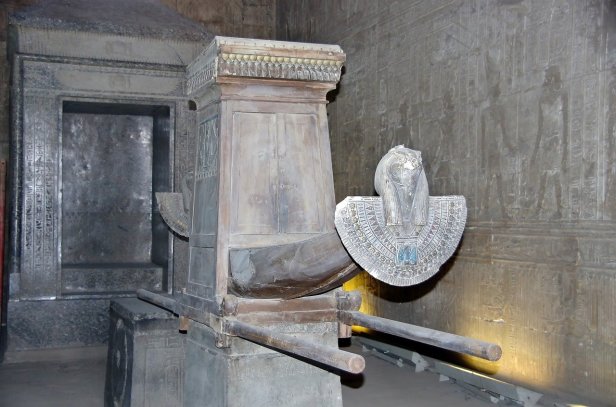 En otras formas de culto, a un costado del arca del dios, se encontraba una litera en forma de barca sagrada, cuya función era la de transportar el naos o la estatua del dios por los sacerdotes al ser sacada del templo en procesiones rituales. Estas procesiones tenían la función de mostrar al dios ante los ojos de los ciudadanos egipcios en festivales y liturgias donde era partícipe la población que seguía el cortejo sacerdotal en medio de un desfile. La camilla donde era transportada la estatua del dios en forma de barcaza representaba el viaje del dios por el firmamento.