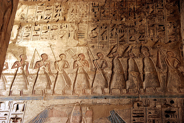Durante el reinado de Ramsés III, en la XX dinastía, el personal del templo religioso de Karnak (consagrado a Amón y múltiples dioses en diferentes capillas) se componía de más de 80,000 trabajadores entre sacerdotes y personal contratado, quienes se encargaban tanto de atender los rituales del dios Amón como toda su heredad, la cual ocupaba más de 1.400 kilómetros cuadrados de tierras, donde eran criadas cerca de 400,000 cabezas de ganado además de contar con cultivos, estando repartidos en un total de 65 poblados. Una flota mercante de 85 embarcaciones se encargaba del transporte de materiales al templo a través del Nilo, trayendo consigo diversos productos desde diferentes puntos de Egipto y desde tierras lejanas para cubrir las necesidades del templo. Otros templos como el santuario del dios Anubis en el Fayum, solo contaba con unas sesenta personas laborando en su interior.