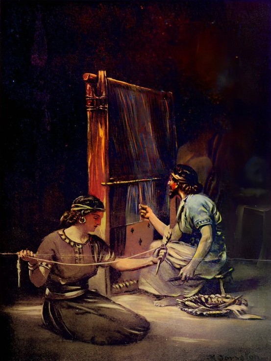 Con la vestimenta, tras la domesticación de animales como la oveja, la lana se convirtió en el material más común para manufacturar prendas de vestir. El cuero de los animales se utilizó para la fabricación de calzado (sandalias/botas) y cinturones. Posteriormente utilizarían el lino. La prendas de lana eran para las clases bajas; el lino para las élites, producidos por telares bajos y horizontales en talleres y hogares. Hacia el siglo VIII a.C. se introdujo el algodón. Los ciudadanos más acaudalados y de la nobleza podían permitirse el uso de ropa teñida con colores brillantes. Las personas de menor rango social usaban prendas más sencillas de color blanco o gris; aunque podía haber excepciones.
