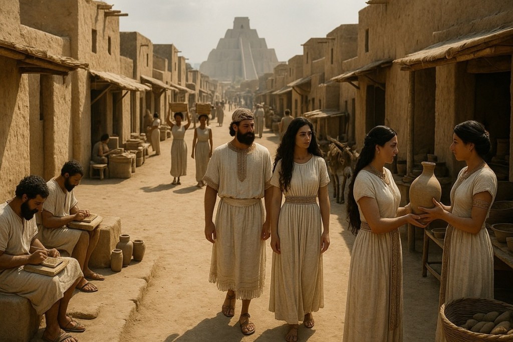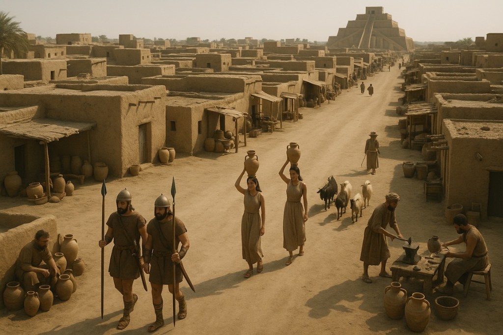 En el perímetro de la ciudad podían apreciarse los canales, conteniendo puertos donde atracan embarcaciones que transportan y descargan diversas mercancías por lo que era común ver a portadores, tanto hombres y mujeres acarreando bultos, cestos con granos o tinajas en sus hombros o sobre sus cabezas circulando desde los muelles hacia los almacenes. El comercio por vía terrestre, importante en Mesopotamia, se hacía por burros cargados con cestos o canastas sobre sus lomos. Al mismo tiempo surgen ocasionalmente festejos y procesiones de los sacerdotes y sacerdotisas con la estatua del dios tutelar de la ciudad, junto a bailarinas y músicos amenizando las fiestas religiosas; además del paso de milicias que resguardan las entradas de acceso a la ciudad o que marchaban hacia una incursión en el exterior.