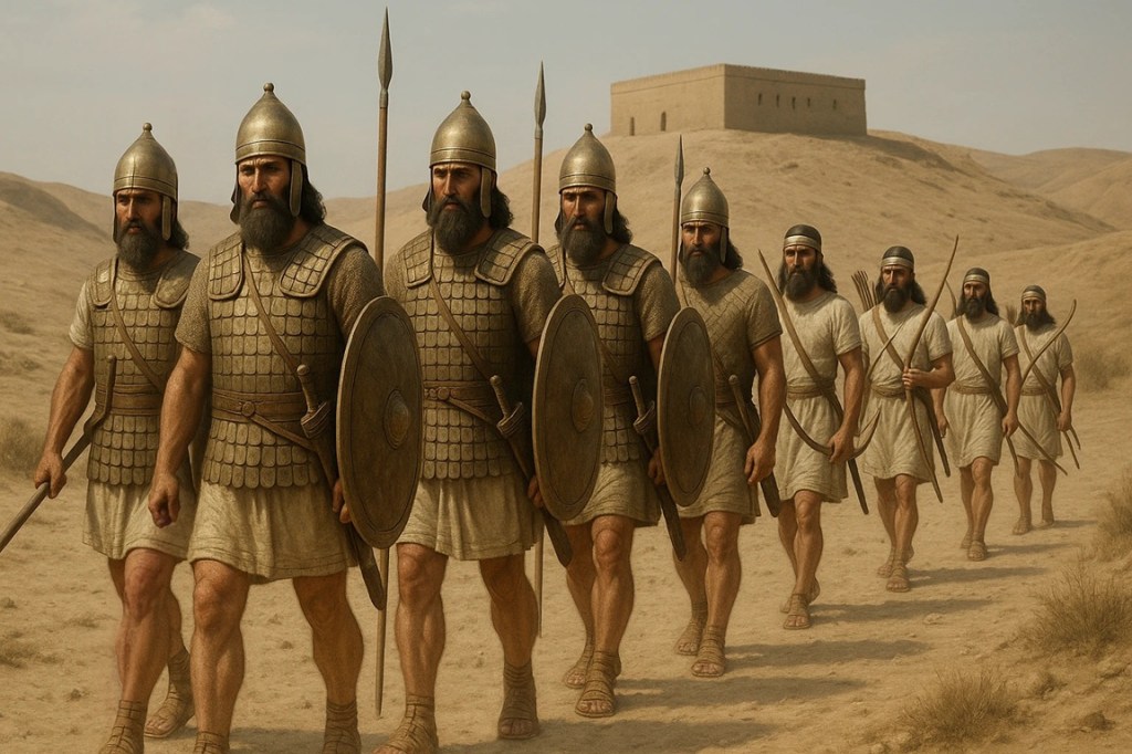 Los militares y guardias en época sumeria utilizaban el cáunace; pero con el paso del tiempo, los soldados usaron túnicas y mantos cortos que cubrían el torso y caderas, el cual finalizaba a la altura de las rodillas, sujeto con un ceñidor sobre la cintura, dejando libres los brazos y piernas para el movimiento. Con los siglos añadieron petos de cuero y posteriormente armaduras y cascos de metal (hacia el 1,200 a. de J.C.) como protección y botas de cuero de animal.