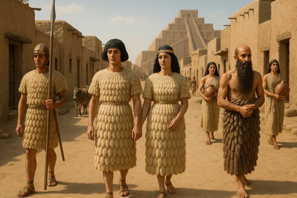 Aunque sumerios, babilonios, acadios, asirios y caldeos tuvieron sus diferencias, también asimilaron ciertos aspectos a lo largo de su historia como el vestuario que mantuvo en ocasiones un estilo uniforme o semejante por espacio de siglos con algunas diferencias. En tiempos protosumerios se utilizaban los taparrabos que podían teñirse de colores vistosos. En Sumeria los hombres de clases altas podían vestir una túnica larga confeccionada de lino, sujeta con cinturones y sandalias de cuero. Las mujeres de clases altas podían vestir: túnicas ajustadas que cubrían todo el cuerpo acompañados de chales y velos con collares y joyas corporales. Sin embargo, en Sumeria, (y en tiempos protosumerios) la prenda popular para los hombres y mujeres junto al taparrabo era una falda rectangular llamada: Cáunace (Kaunake en griego).