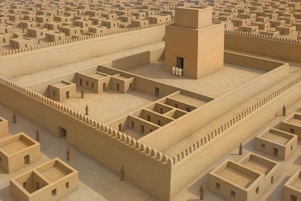 En el interior de la ciudad, el centro solía ocuparlo el templo tutelar para los dioses o Cella junto con el Zigurat (templo del dios tutelar), el palacio real y las dependencias reales. Alrededor del palacio estaban las oficinas de los escribas y los funcionarios. Inmediatamente a estos últimos había una densa masa de casas de barro, almacenes, escuelas o «Casas de Tablillas» (que fungían como bibliotecas), talleres de productos textiles y de cuero, talleres de alfareros, carpinterías, graneros y guarniciones militares. Las calles dentro de la ciudad, llamadas: Súqu (acadio), eran de tierra aplanada, polvorientas y sinuosas serpenteando entre la edificación de las casas que no guardaban un orden establecido. En estas calles marchaban rebaños de ovejas y cabras, cerdos, bueyes y vacas. Entre las calles más espaciosas y las plazas cercanas al templo fluyen los puestos de los mercados en forma de bazares agrupados, donde los comerciantes y mercaderes ofrecían sus productos, compartiendo espacio insertados entre las casas con los puestos de los artesanos y alfareros, los zapateros, los barberos, los tintoreros y los escultores, seguidos por unos metros más de los mostradores de ladrillo con pan de las panaderías con sus hornos de ladrillos.