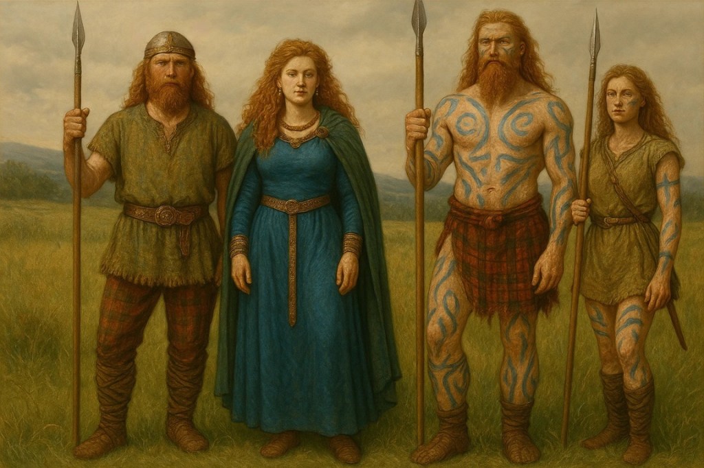 Los celtas eran conocidos por griegos y romanos por su aspecto físico característico, en general: altos, de cabellos castaños, rubios y pelirrojos, y ojos claros: grises, azules o verdes. Diodoro de Sicilia, historiador griego del siglo I a.C., escribió en sus crónicas sobre los celtas: “Los galos son de alta talla, con poderosa musculatura y blanca piel. Su cabello es rubio y no sólo de modo natural sino que utilizan medios artificiales para aumentar el color que la naturaleza les da (…) algunos se afeitan la barba, otros la usan un poco crecida y los nobles se rasuran el rostro pero se dejan crecer el bigote hasta que oculta la boca”.