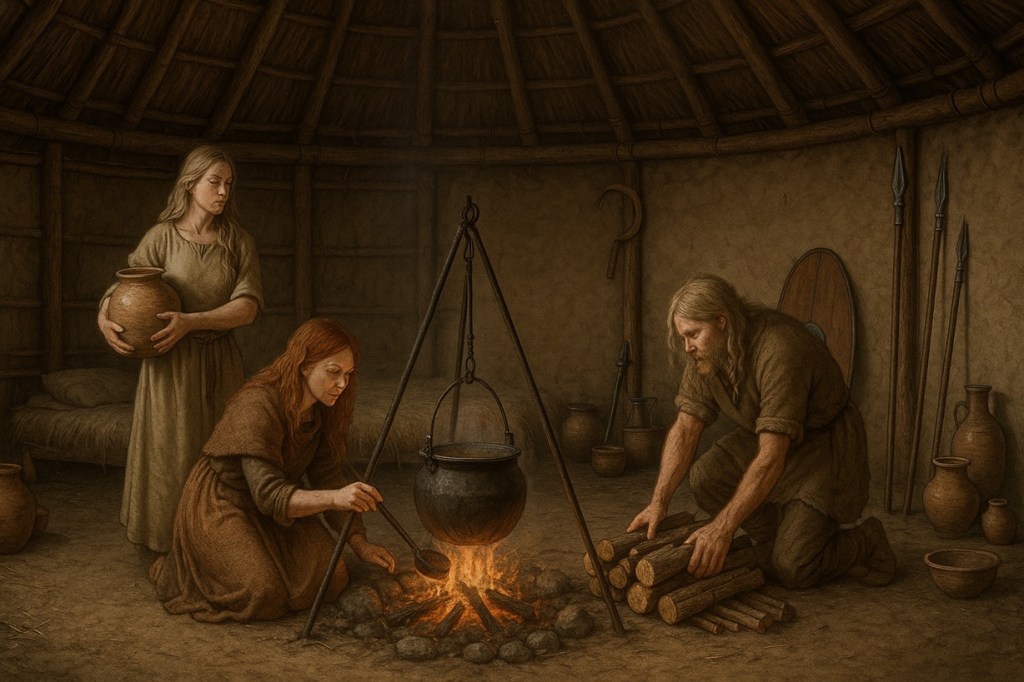En su interior las casas celtas contaban con un fuego central en forma de un pequeño agujero excavado en la tierra donde depositaban la madera para darle fuego. Podía encontrarse un telar de lana, camas hechas de arcilla recubiertas de pieles gruesas para el frío o camas de simple paja con gruesas mantas. La ropa y las herramientas colgaban de las paredes. Entre éstas últimas hoces, guadañas, cuchillos, hachas y cuencos.Habían cestos de mimbre y bancos adosados a las paredes. Las mantas estaban hechas de pelaje de animales y lana. Cuencos de barro servían para almacenar granos y agua. La gran mayoría de las casas celtas contaban con campos de cultivo en su entorno, los cuáles eran generalmente rectangulares, donde la familia estaba obligada a trabajarlos. Los granos de la cosecha eran almacenados en pozos o depósitos circulares cubiertos con esterillas de juncos entrelazados y revestidos al interior con piedras o mimbre y sellados con arcilla. Estos depósitos estaban ubicados dentro de las viviendas más grandes o un costado de la casa.
