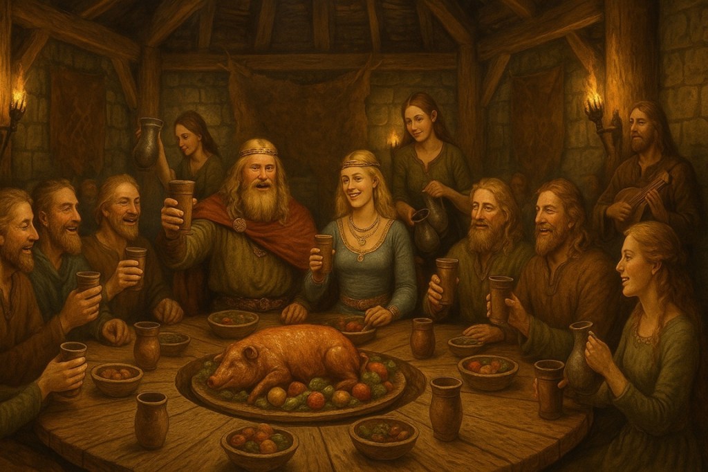 La dieta común de los pobladores celtas estaba basado en el consumo de: carne de res, oveja, pescado, salmón, venado, pato, cerdo y jabalí, preparadas en asador o al interior de calderos. Consumían gachas de avena preparados en calderos y era parte de la comida habitual de los celtas. Consumían cerveza hecha de cebada e hidromiel. También consumían la miel, queso, mantequilla y el pan de trigo. Por lo común en una casa celta la familia comía alrededor de una mesa baja sentados con las piernas cruzadas o en cuclillas. La comida era servida en platos de madera en forma de cuencos y comían con los dedos.